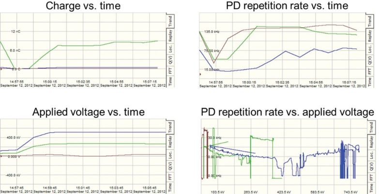 Q(U) will form a graph that shows the relationship between test voltage level and PD charge magnitude. Figure 3 shows examples of real PD measurements.